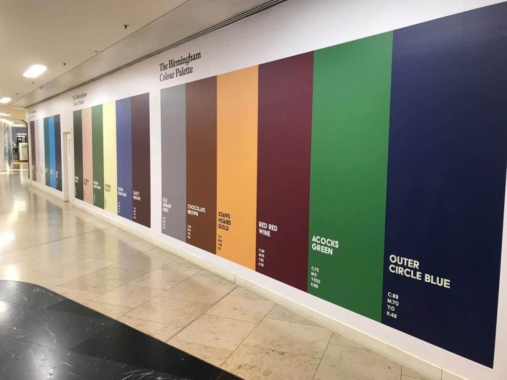Birmingham New Street (the central hub for trains in England's second-largest city) has a color palette for the city. It's a tongue-in-cheek homage to a number of iconic elements throughout the city, but still a lot of fun colors.