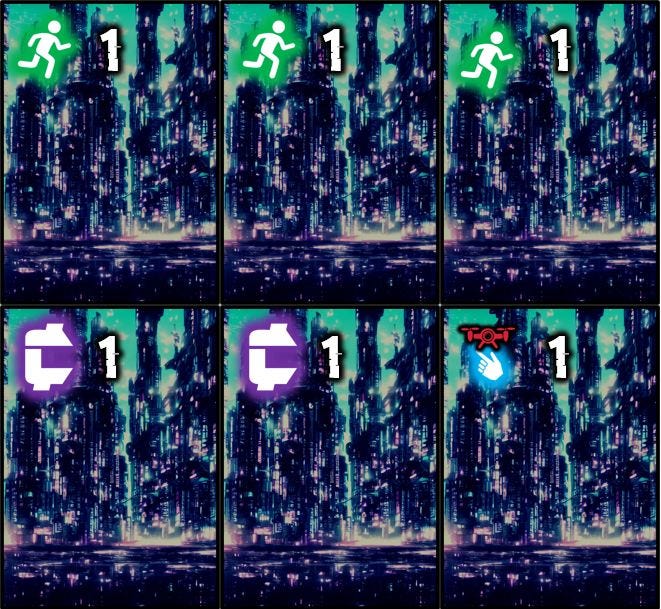 The 6 starting cards to start the game – 3 cards that let you move, 2 cards that gave you credits, and 1 card that lets you distract the drones throughout the cyberpunk world. You would draw 3 cards each turn, then choose the order to play them. The cards you purchased had better and more actions on them. (Later on, these cards would each give 2 actions to get a bit more action each turn.)