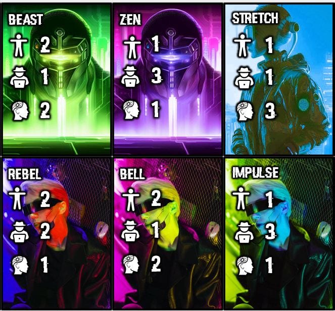Also from version 3, these were some of the first character cards. You had three starting stats (from top to bottom: physical strength, hacking ability, and number of starting wetware upgrades). You had plenty of ability to upgrade them further, and they gave you a bit of asymmetry from the start of the game.