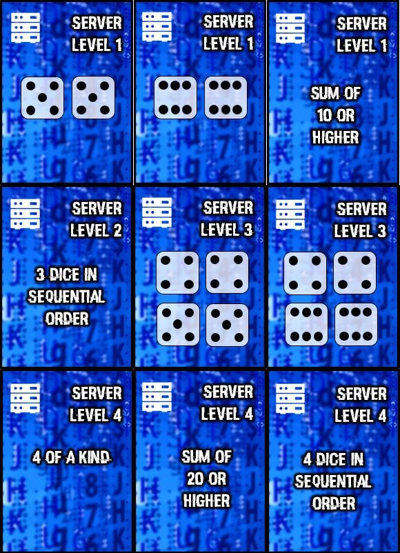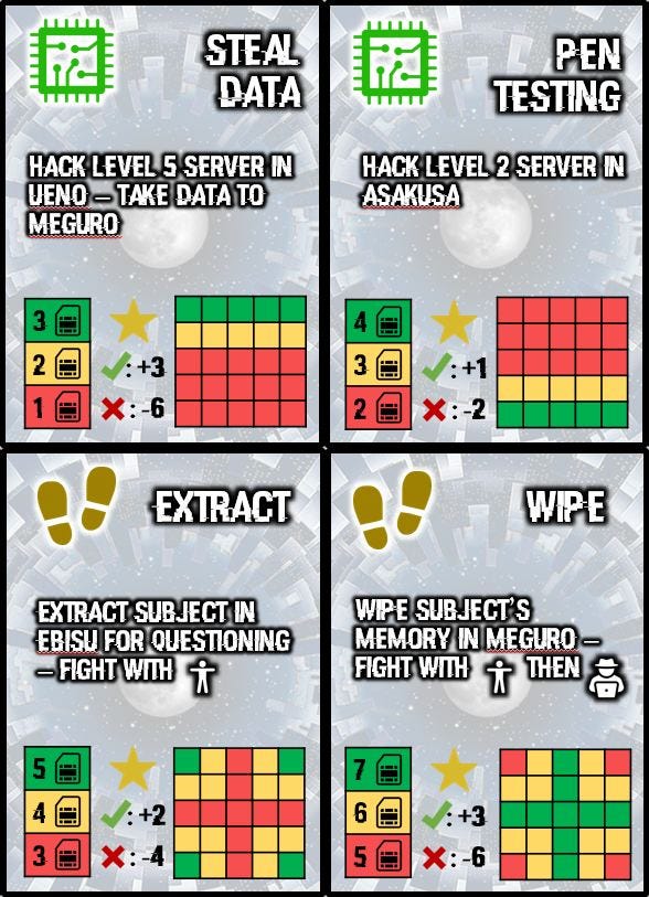 Some of the ‘server cards’ – when you accepted a hacking gig and arrived at the current location, you would draw a card and roll dice equal to one of your levels. This is where your wetware abilities would help out (they typically had let you manipulate or reroll your dice), but every time you ended your roll without succeeding, a drone would move one space towards you. Make sure you succeeded before you were caught or you’d lose some reputation!