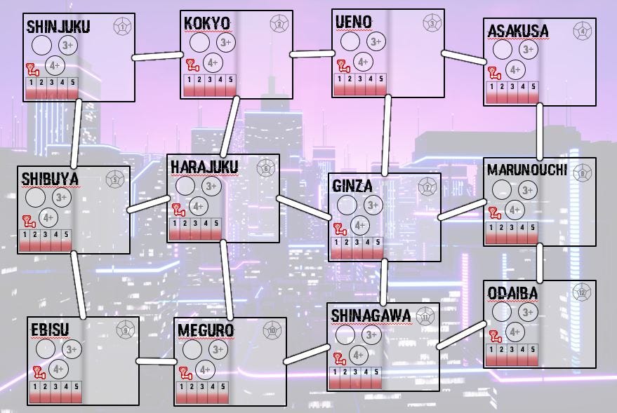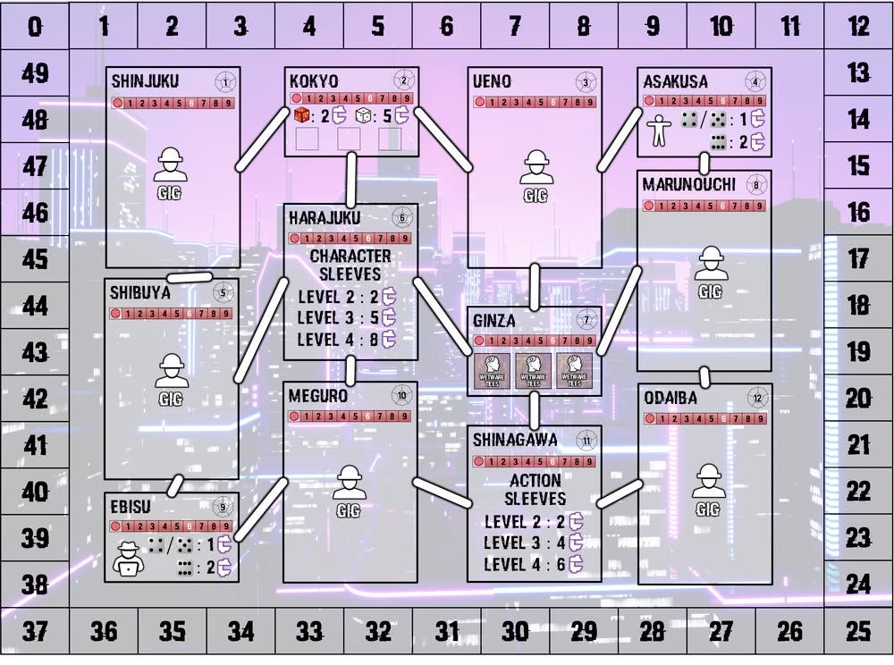 The board by itself tells part of the story – move around Tokyo, and what you could do was based on where you went. Gigs were in some places, and there was the ability to improve your deck abilities (at this point, they were ‘action sleeves’ and ‘character sleeves’) along with some other opportunities.