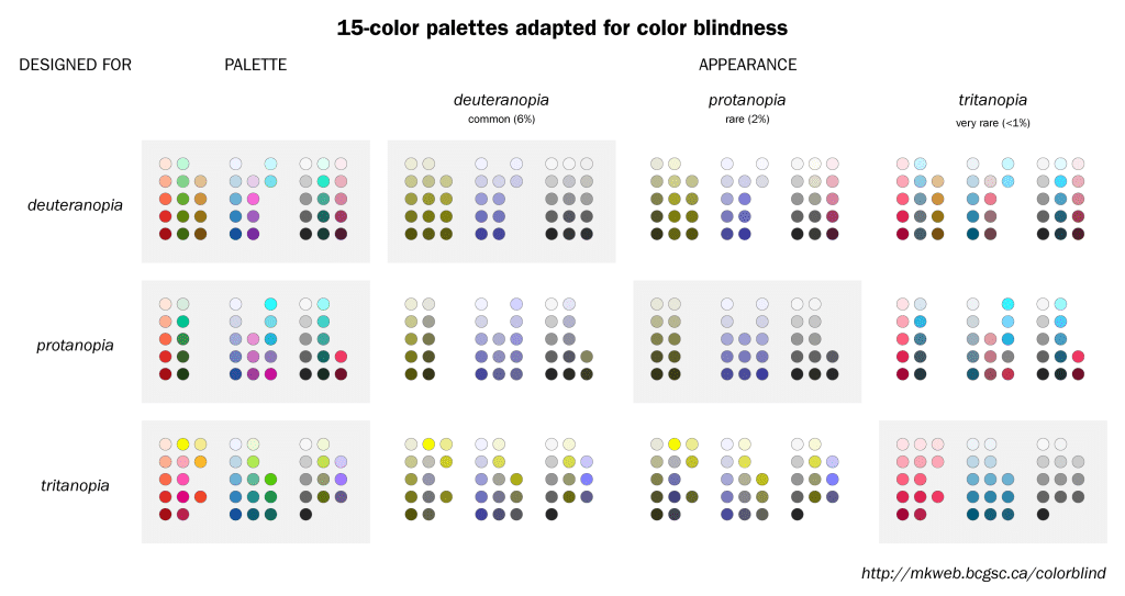 This last one is a little more complicated. The left column of boxes show 15 groups of 1-3 colors. Use any color in a given group, but not more than one. The shaded boxes indicate how those groups of colors will be seen through the eyes of the three types of color-blindness.
