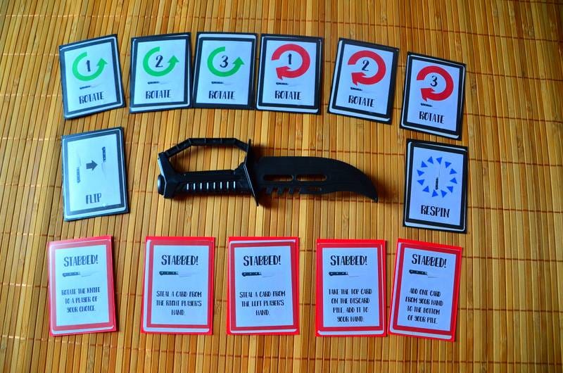 Spin the Knife: a simple party game about spinning a (plastic) knife and trying to deflect it away from you with cards. If you get stabbed, the 'stabbed!' card gives you a special power you can use each round. The game ends when one person has been stabbed three times. They're eliminated, and whoever has the most cards in their hand wins. There's a lot of luck in this inaugural version, and there are tough choices between playing cards (which let you deflect the knife towards someone else) and keeping them in your hand (most cards here at the end of the game wins)