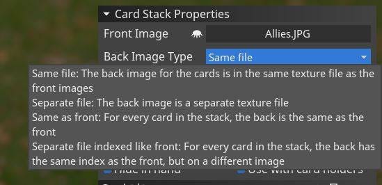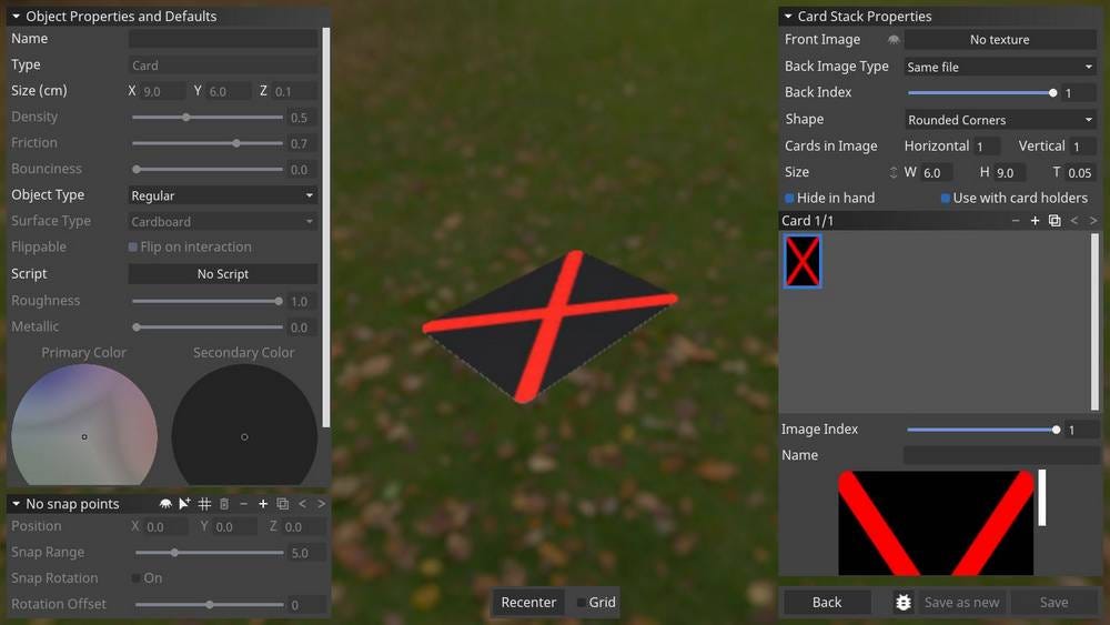 Oh, boy... Lot going on here... Give it a name in the upper left corner, choose a size (unless I missed something, you can't scale a card on the table with + or -), then begin choosing other details along the left side. Add textures to the card's front(s) and back(s) in the upper right corner. The program can split a single file into many cards like Tabletop Simulator — but Tabletop Playground goes one step further by offering a preview of each card in question in the Image Index.