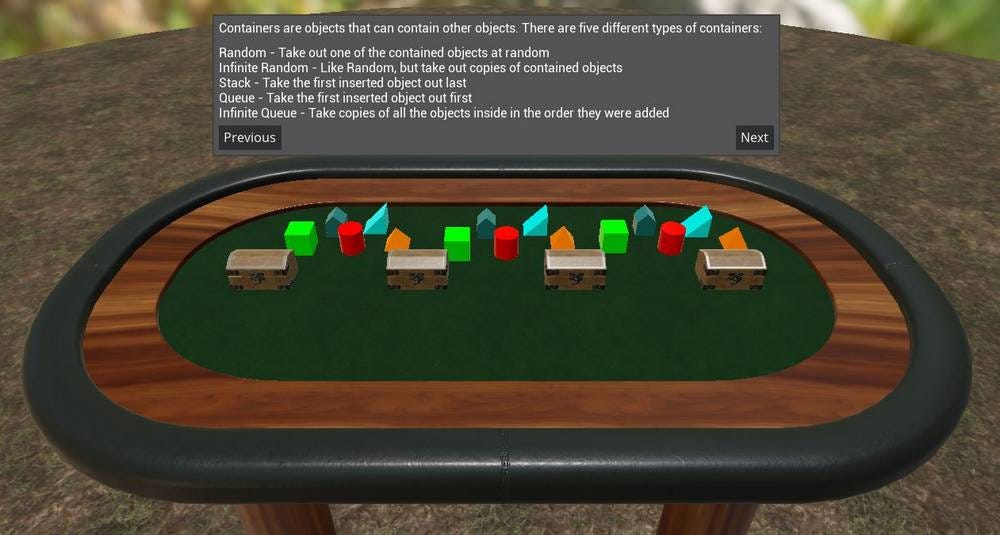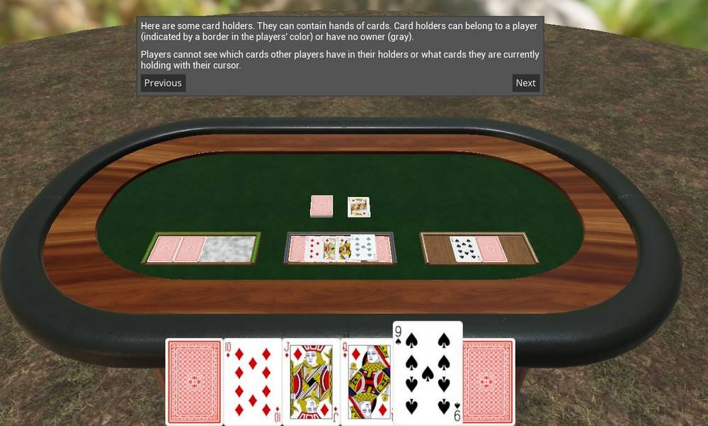 If you're coming from Tabletop Simulator, many (but not all) of the keyboard shortcuts are similar. One of the highlights (as seen above) is a three-level series of tutorials that walk you through how to play a game on Tabletop Playground, along with the many things available. Each of these takes about 5-10 minutes to walk through, and everything on the table can be manipulated. The card holders take up some space on the table, but can hide or reveal cards as the creator would like.