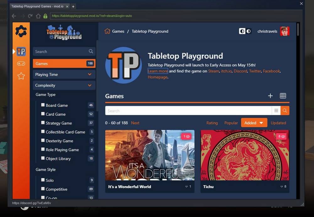 After logging into mod.io, confirming your e-mail, and agreeing to their terms and conditions, you'll be able to browse user-made games in the built-in Steam browser. (You can also start from https://tabletopplayground.mod.io outside the program, if you prefer.) Either way, you'll need the program to play.