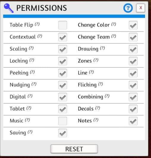 If you've ever tried to hit Tab to point to something and realized it's not working, those are the permissions hard at work. By default, Tabletop Simulator allows players to do anything the host can - including flip the table, access the tablet, and otherwise edit things. As the designer, you might not want players to mess with some stuff.