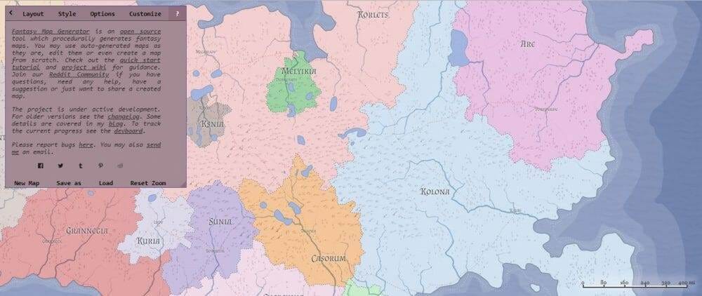 https://azgaar.github.io/Fantasy-Map-Generator/ — give you one guess what this site makes. If you haven't guessed, look up. This is a pretty serious tool, with tons of options to procedurally generate, customize, and change virtually every aspect of a map. The project is open-source and features an active Reddit community, but I wasn't able to 100% confirm the copyright nature of what you create. Feel free to e-mail the creator or ask on the Reddit group.